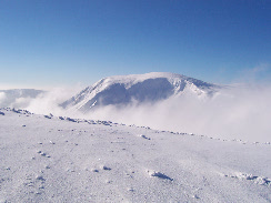 Wir überschreiten die Sněžka (Schneekoppe), den mit 1602 m höchsten Berg des Riesengebirges und wandern weiter Richtung Mala Upa, wo wir bei meiner Schneeschuhwanderwoche mit festem Quartier wohnen.